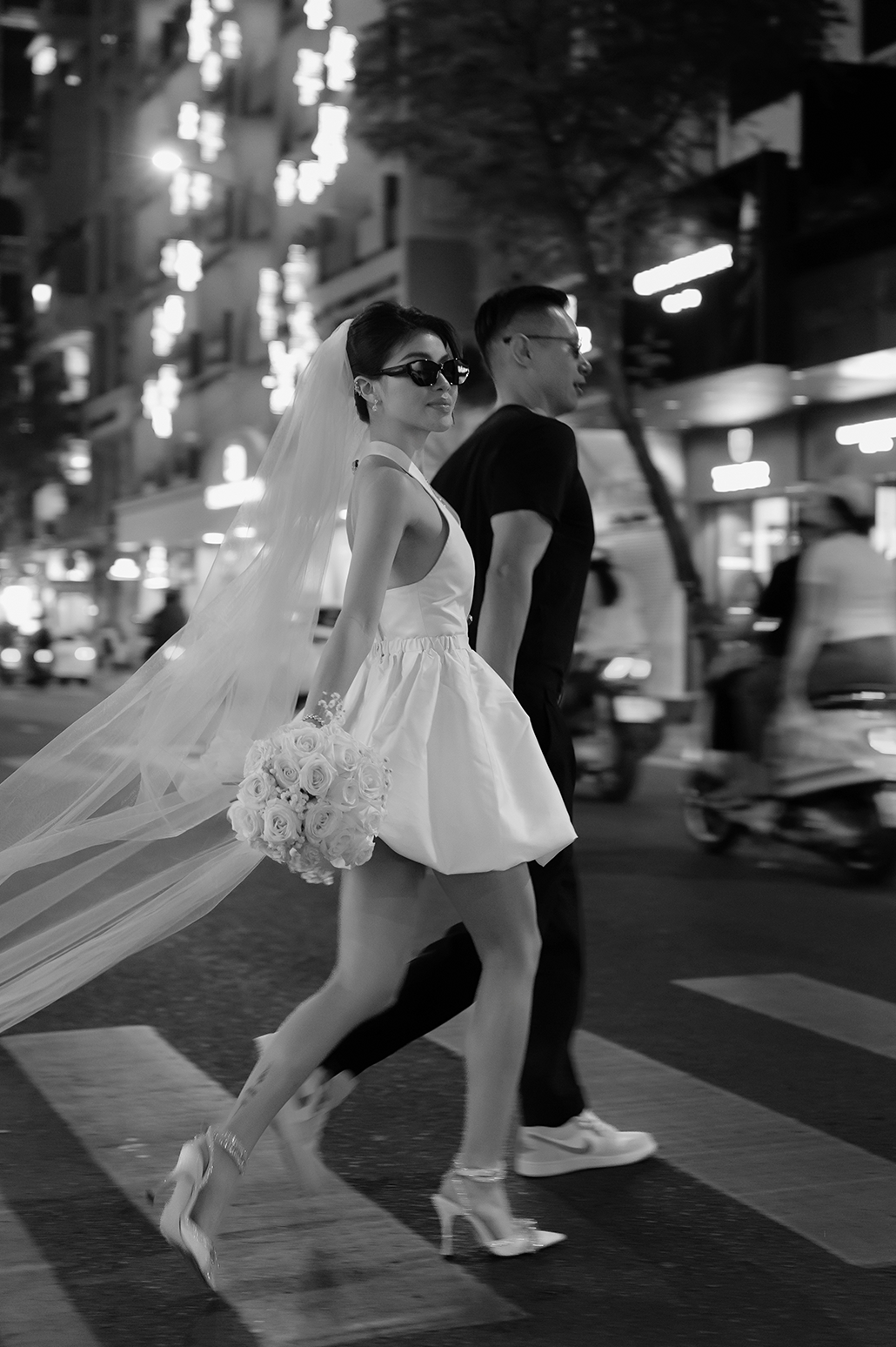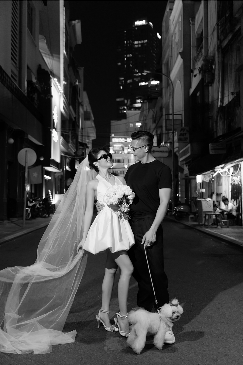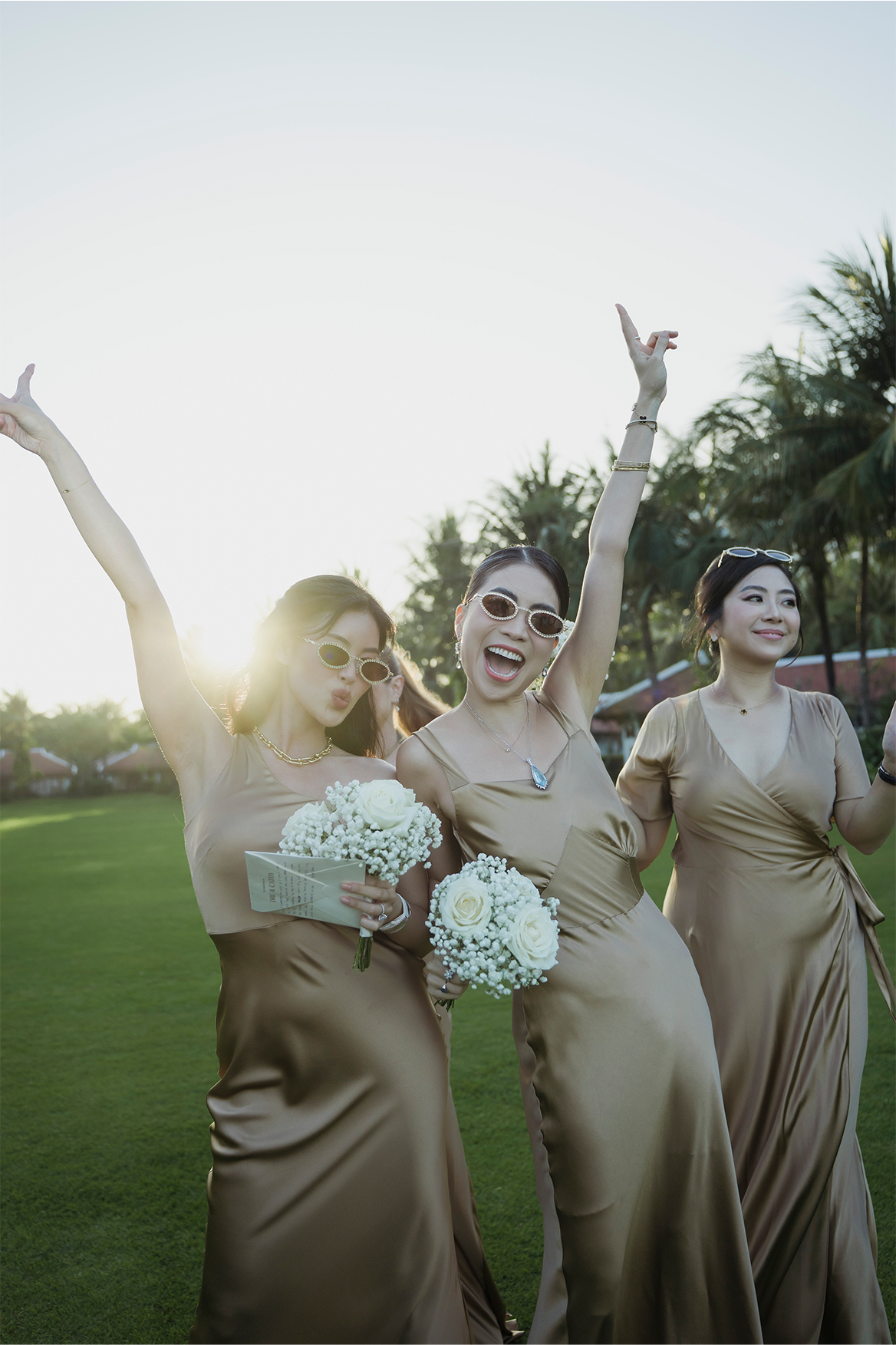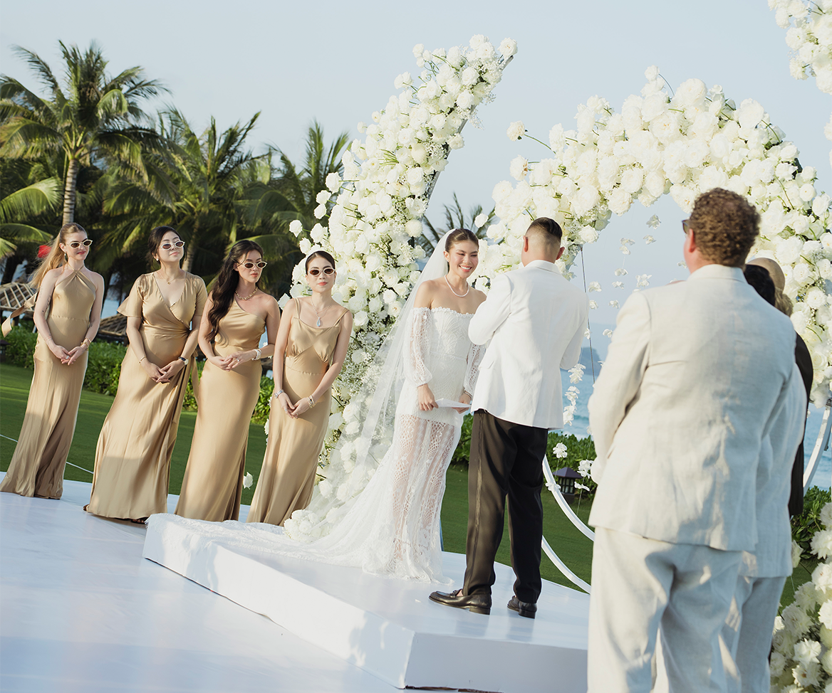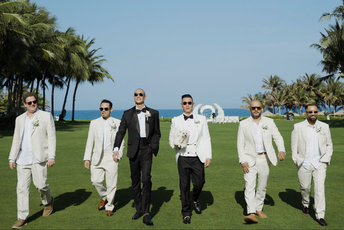 The collection seamlessly blended heritage and modern elegance: 1970s inspired áo dài in pure Vietnamese silk, champagne toned satin dresses for the bridesmaids, feather trimmed pajamas, and 100% linen suits for the groomsmen. The groom was dressed in a Gatsby inspired three piece tuxedo, refined and timeless, with a subtle nod to the glamour of the 1920s.