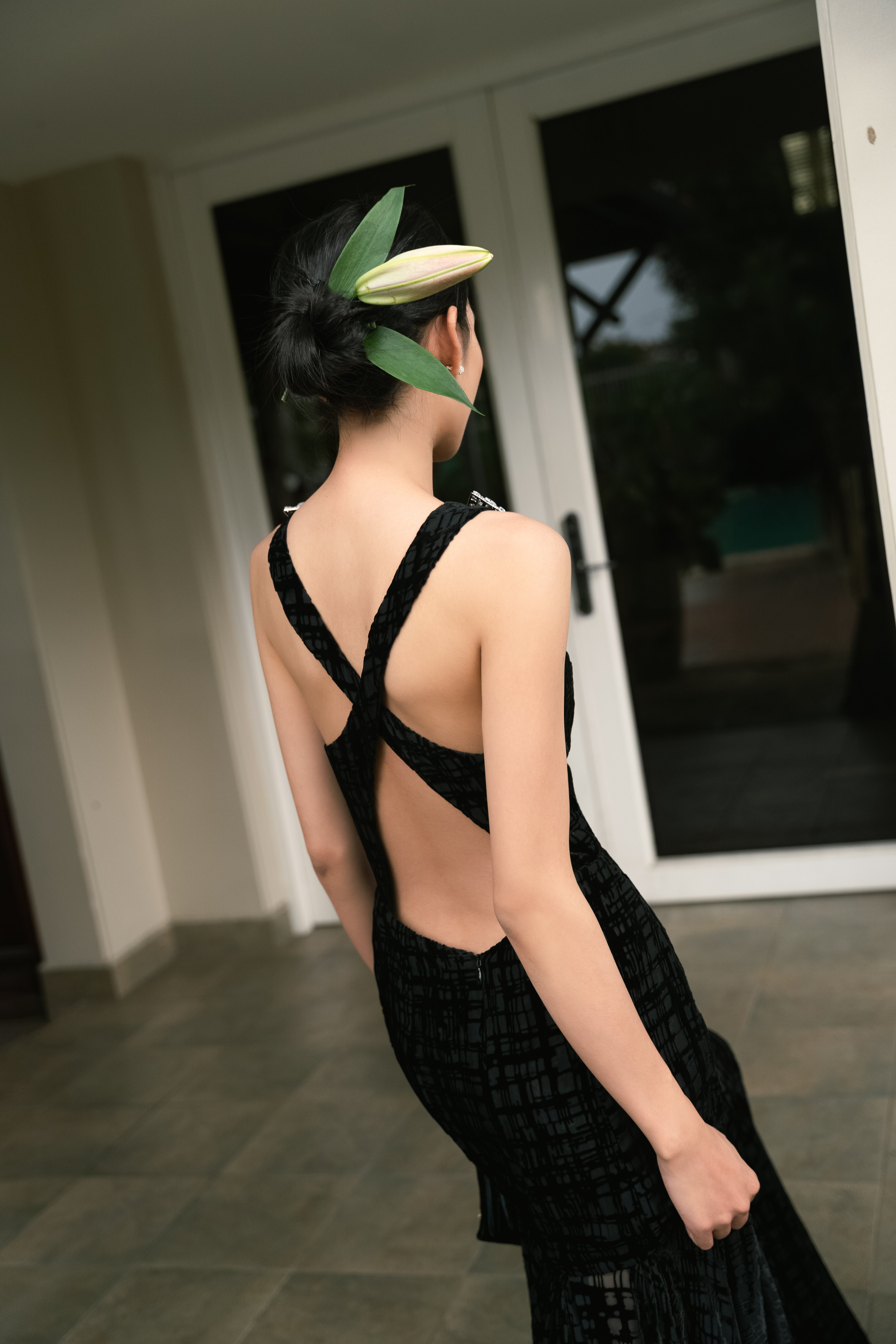 Let us know your measurements (bust, waist, hips, and height), and we’ll make it just right for you.The long black dress made of luxurious embossed velvet hugs the curves and highlights the elegant beauty full of power.