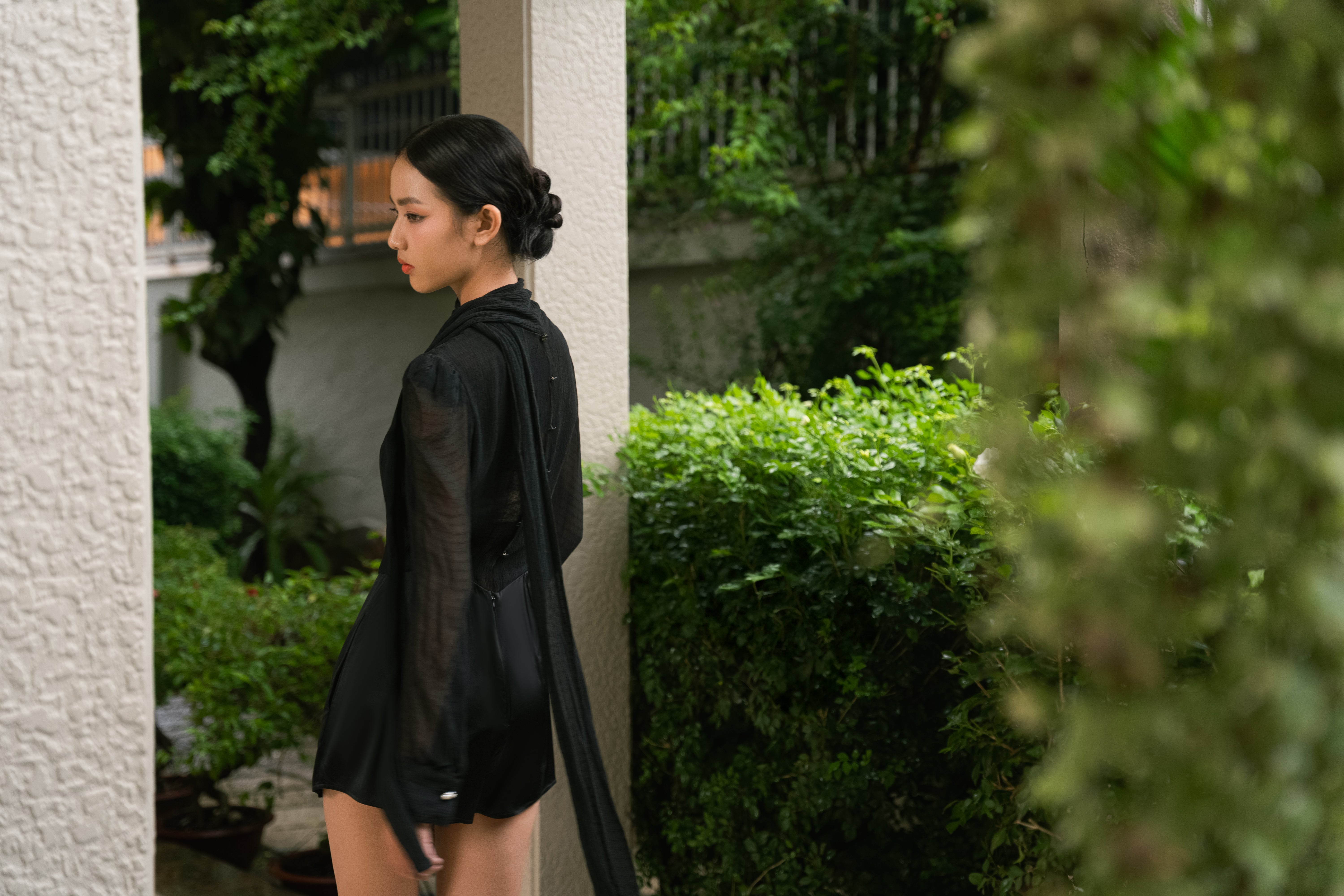Let us know your measurements (bust, waist, hips, and height), and we’ll make it just right for you.A sleek black jumpsuit with sheer sleeves and a scarf-neck detail, balancing sophistication with a modern, feminine edge.